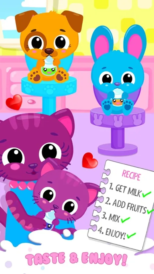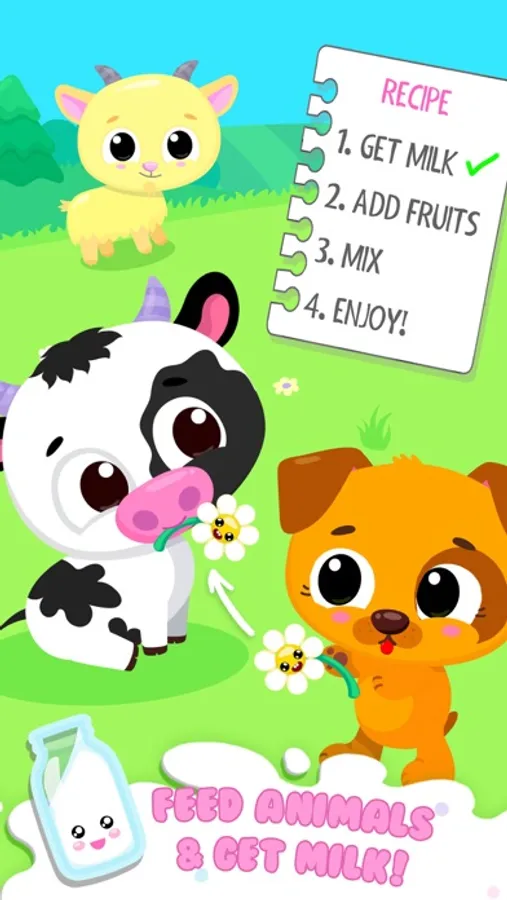 First of all, we need some milk! Who knows everything about milk? That’s right - cows and goats! Let’s visit them! Now add colorful juicy fruits and berries and mix everything! Looks delicious! Let’s taste the milkshakes with kitty Sue, puppy Bu and Bunny Blu! Baby animals are full and happy now!