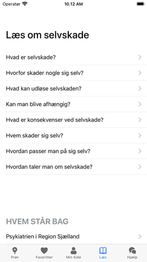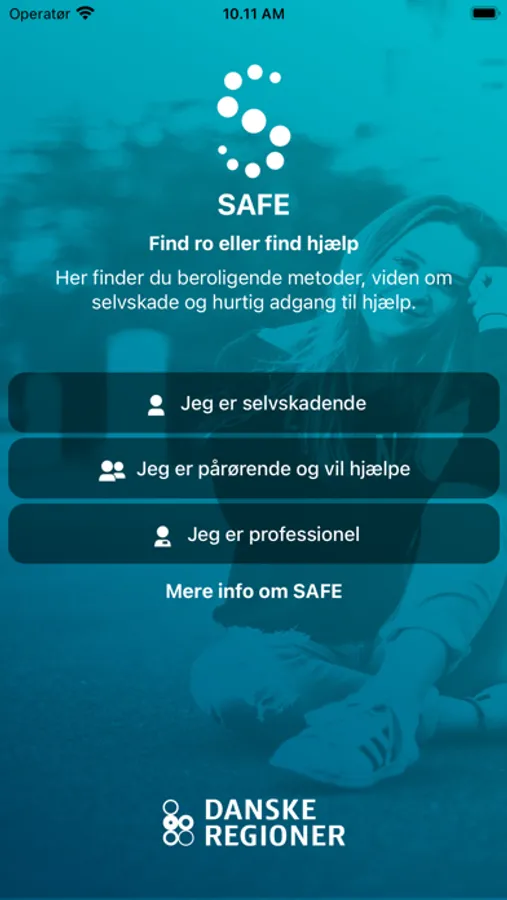 SAFE henvender sig til dig der selvskader eller har selvskade tæt inde på livet. Med SAFE kan du få inspiration til berolignende metoder, viden om selvskade og hurtig adgang til hjælp. Du kan samle de metoder, som virker bedst for dig på din favoritside og have hurtig adgang til dem der. Hvis du er pårørende eller professionel, kan du finde konkrete eksempler og gode råd til, hvordan du kan hjælpe. Hvis du har brug for rådgivning kan du finde hotlines med direkte adgang til chat, sms og telefonrådgivning. hvis du står i en akut situation og har brug for professionel hjælp, kan du finde nærmeste skadestue eller psykiatriske akutmodtagelse og ringe til dem eller få hjælp til at finde vej.