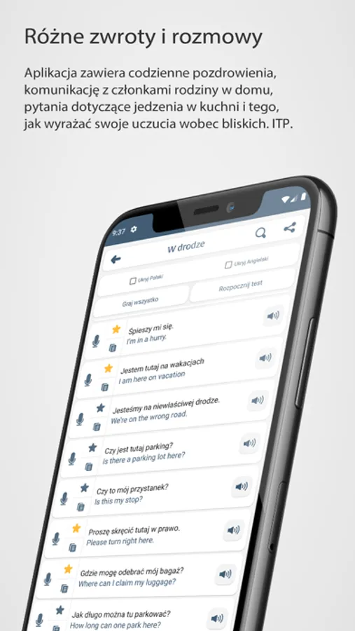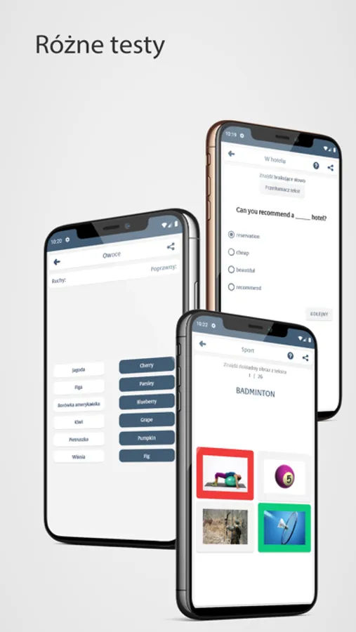 Sprawdź swoją wiedzę za pomocą różnych typów testów oferowanych przez aplikację, takich jak: łączenie słów o tym samym znaczeniu, znajdowanie poprawnej odpowiedzi z obrazka, tłumaczenie słowa lub zdania, odsłuchiwanie zdania, a następnie jego pisanie, wypowiadanie zdania które się pojawia i nie tylko.