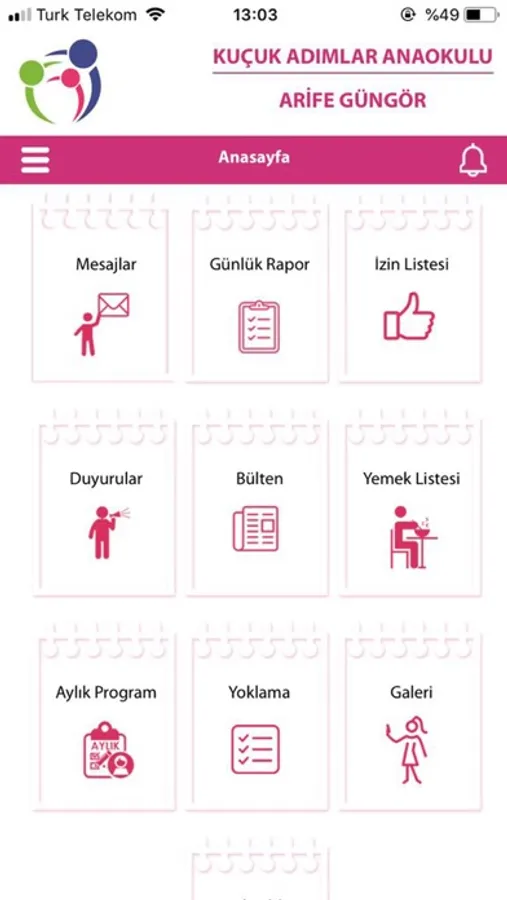 Anaokulumuz ile velilerimiz arasında online köprü kuran mobil uygulamamız, velilerimizin kendi çocuklarının bilgilerine hızlı bir şekilde ulaşmasını sağlamaktadır. Velilerimiz çocuğunun yemek listesi, aylık program, bülten gibi bilgilerine ulaşabildiği gibi, çocuğunun görsellerine de ulaşabilmektedir. Ayrıca kurumla ve öğretmeniyle mesajlaşarak anında bilgi sahibi olabilmektedir.