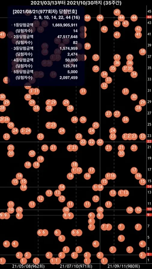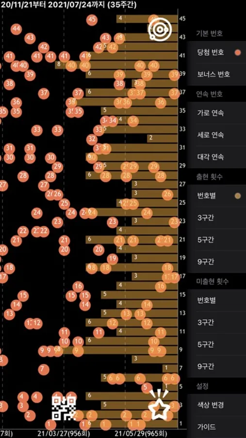 - 연속번호, 당첨분포, 출현횟수, 미출현횟수를 구간별로 확대/축소를 이용하여 확인 할 수 있습니다.
