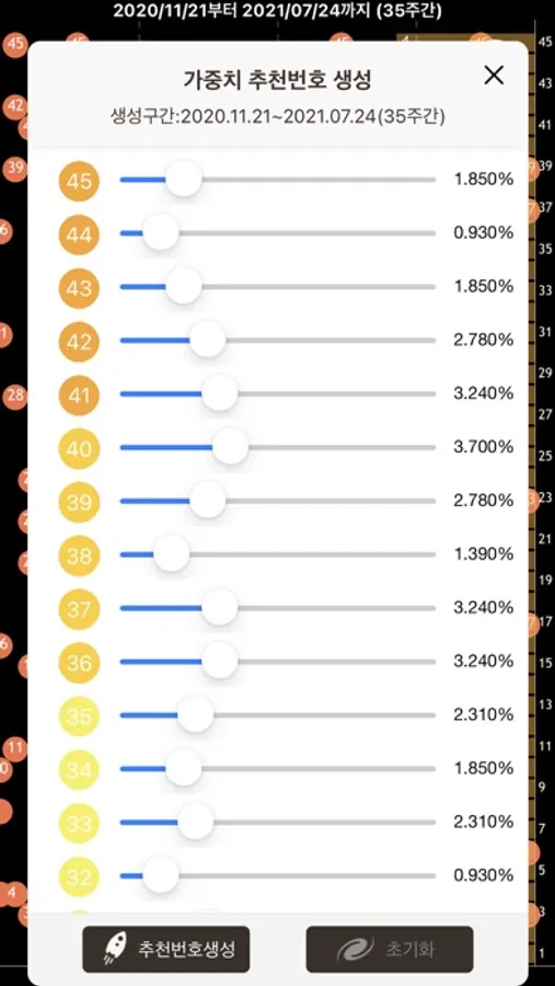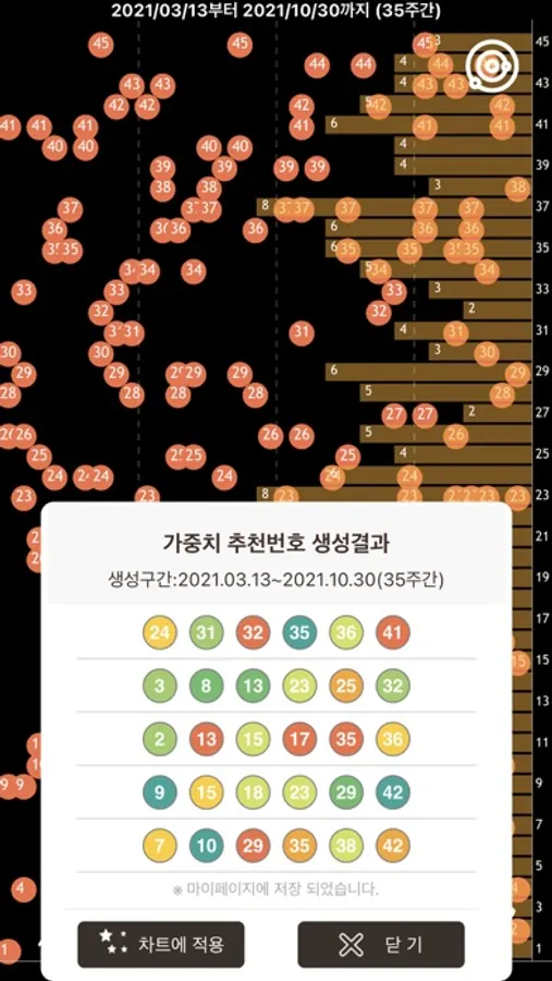 특정 구간의 로또번호 출현 패턴을 여러 각도로 분석하고 가능성이 0.001% 라도 높은 "가중치 예상번호"를 추천받아 보세요.