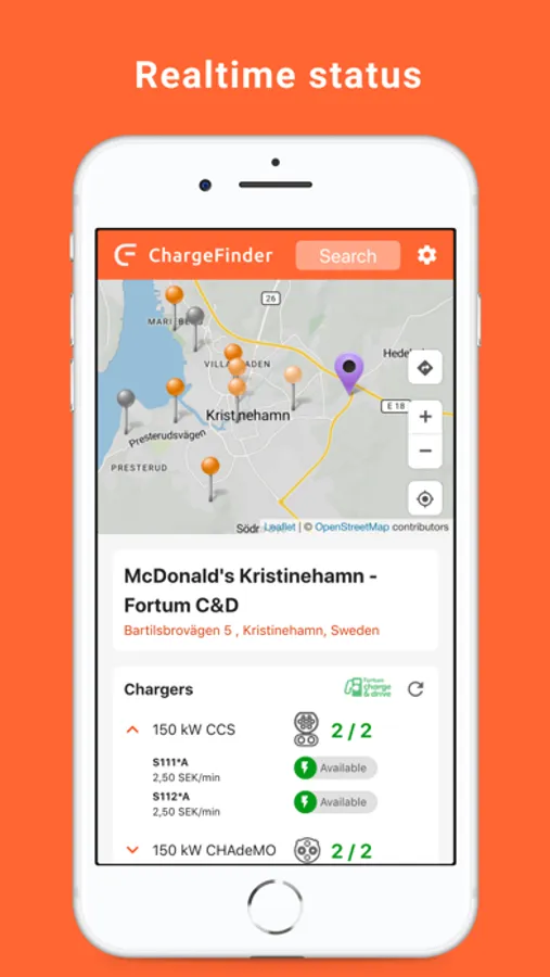 Find charging stations and get information about charging speed, current prices and availability in real time. Live charger status is displayed for all major networks in Scandinavia and several in rest of Europe. In one place you can now see if a charger is idle, busy or out of order regardless of operator. Tips on nearby eateries and other things that can be good to know about the specific place are of course also available.