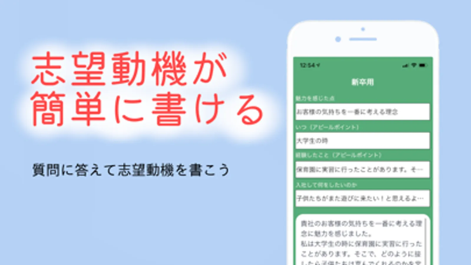 志望動機・志望理由が、質問に答えるだけで完成するアプリです。