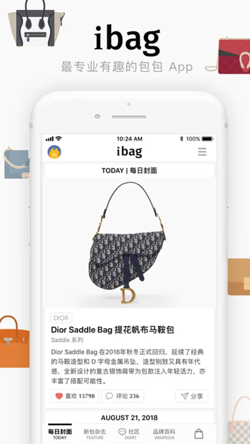「iBag · 包包」是一个女生必备的手袋 App,每一天为你呈现全球最潮流的手袋包包,从超高清大图经典包款评测,到品牌设计师全新作品发布,更有 Fashion 大片、手袋百科、时装故事等超美栏目。