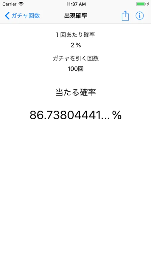 すでに入力した確率とガチャ回数から、連続して回した場合のガチャの当たる確率を表示します。