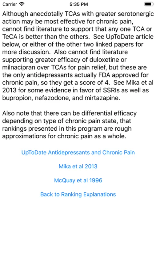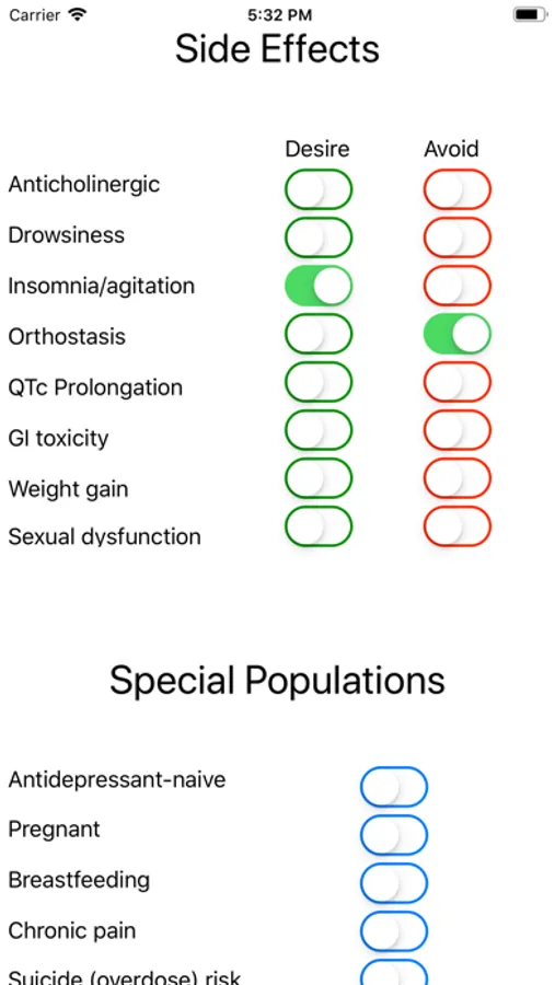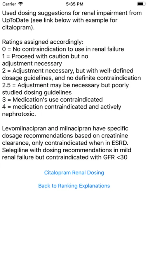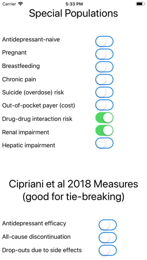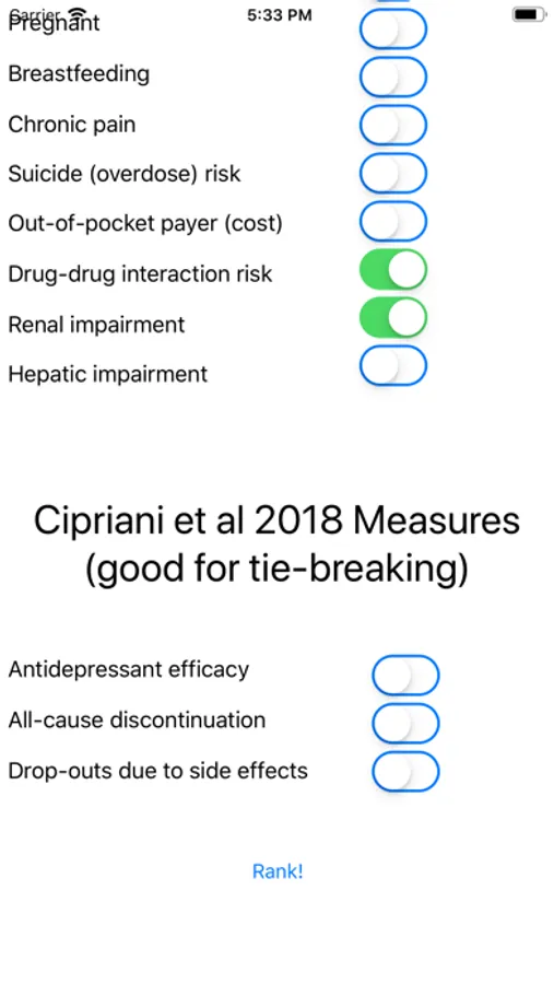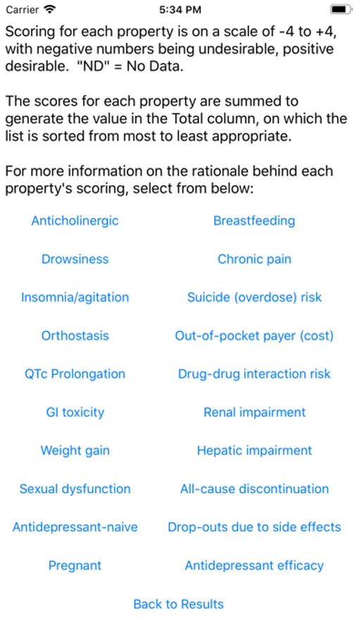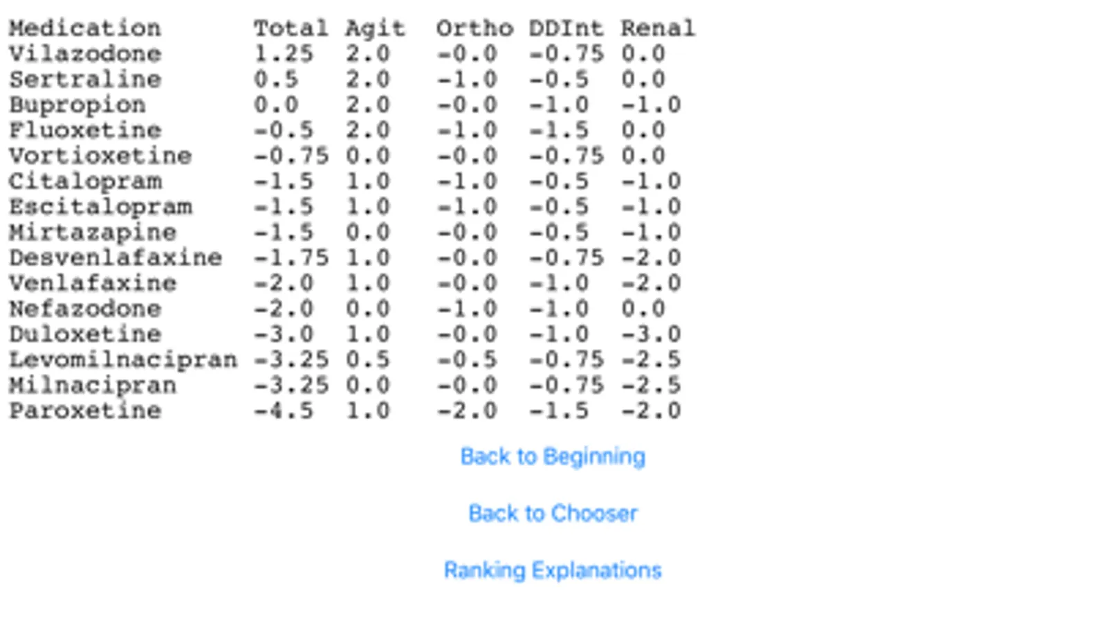 An app that assigns scores for 32 antidepressants on 20 different commonly encountered patient factors/drug measures. Multiple attributes can be selected at once and scores summed to provide an estimated overall ranking of suitability. Explanations for scoring of each attribute is provided, with links to UpToDate and other supporting primary literature.