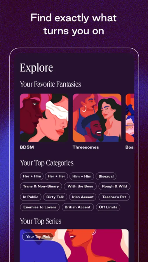 Whether you’re just starting to explore, or know exactly what you like, discover personal recommendations that make the app your own private world. Straight, queer, and genderqueer storylines. Romantic meet cutes, or BDSM and off-limits adventures. American, British, Irish, and Australian accents. 50% of audio is voiced by people of color.