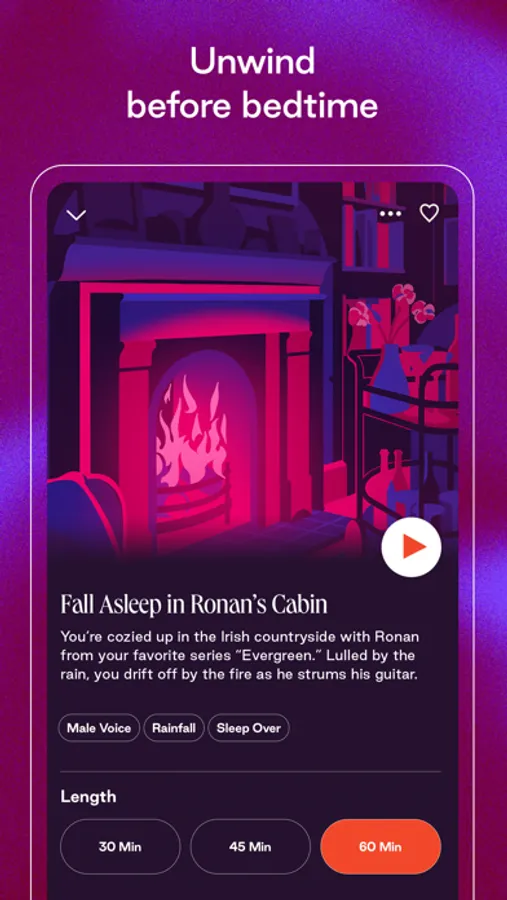 Suspend your state of pleasure and relaxation with sleep stories.Dipsea Sleep Overs offer the sense of cozy of loved ones closeby, just with your favorite characters. Or listen to Soundscapes of soothing sounds like a cabin fireplace during a thunderstorm, or rain on a cottage roof.