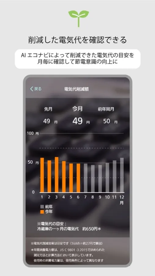 毎月の電気代の削減状況を表示。節電意識のアップにも。