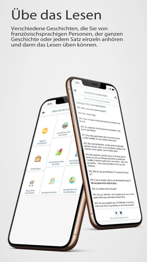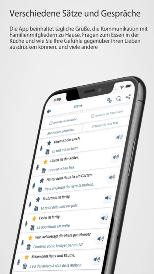 -Übe das Lesen, Sprechen, Zuhören und Schreiben. Die Anwendung bietet auch die Möglichkeit, den Satz von französischsprachigen Personen laut anzuhören.