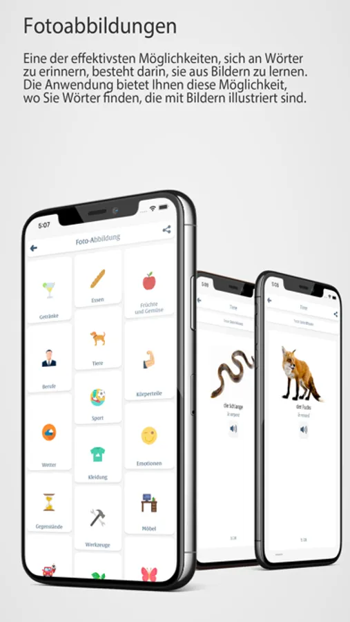 Eine der effektivsten Möglichkeiten, sich an Wörter zu erinnern, besteht darin, sie aus Bildern zu lernen. Die Anwendung bietet Ihnen diese Möglichkeit, wo Sie Wörter finden, die mit Bildern illustriert sind.