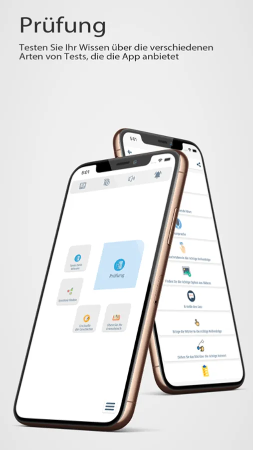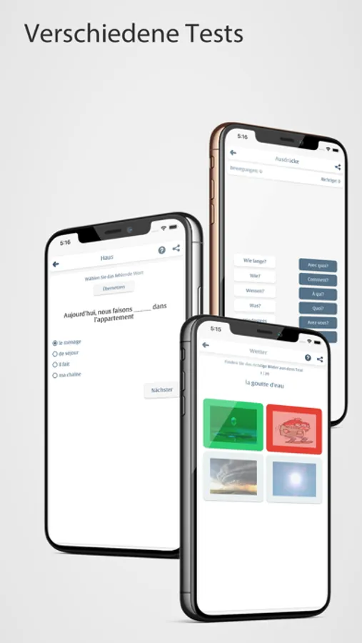 Testen Sie Ihr Wissen über verschiedene Arten von Tests, die von der Anwendung angeboten werden, Verknüpfen von Wörtern mit derselben Bedeutung, Finden der richtigen Antwort aus dem Bild, Übersetzen des Wortes oder Satzes, Hören des Satzes und anschließendes Schreiben, Aussprechen des Satzes, der erscheint und andere.