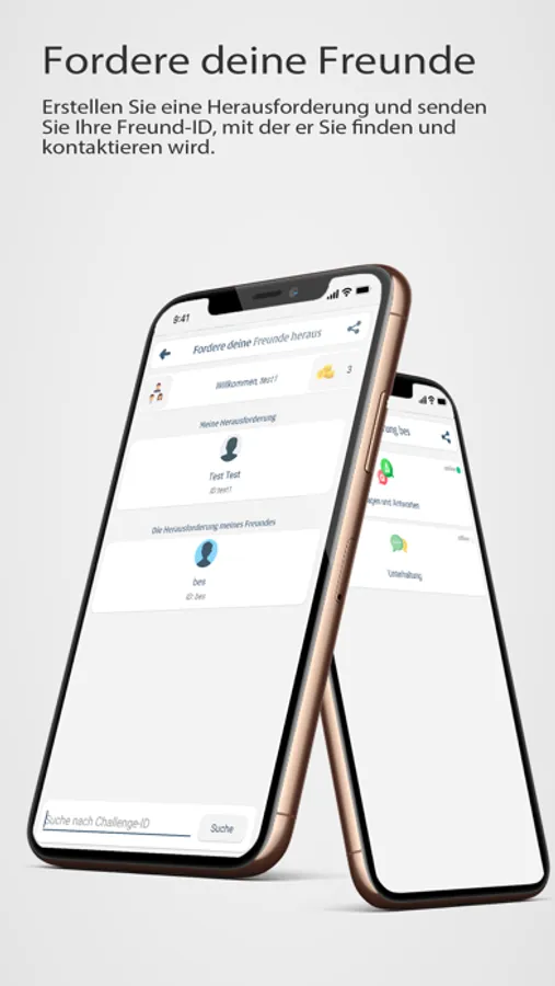 Erstellen Sie eine Herausforderung und senden Sie Ihre Freund-ID, mit der er Sie findet und sich mit Ihnen verbindet. Erstellen Sie innerhalb von Herausforderungen Quizfragen mit Fragen und Antworten und fordern Sie sich gegenseitig heraus oder kommunizieren Sie in Gruppen miteinander.