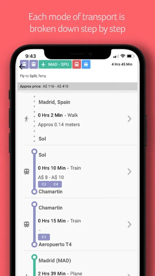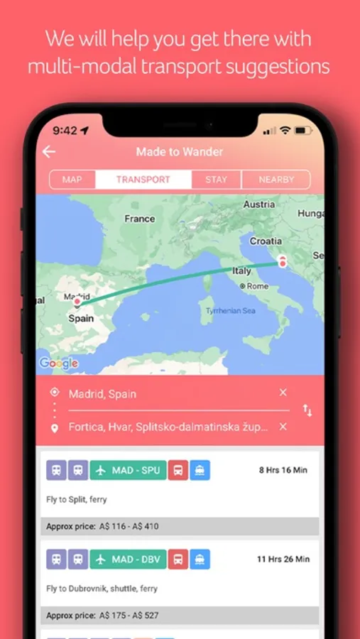 Each photo is geotagged so we can show you where it was taken, but the best part is that we also show you how you can get there with a breakdown of each leg of the trip. Flight, train, bus, ferry, taxis, share car and walking – its all covered. Save travel lists for later and use our route-finder to get you to the places you’ve saved.