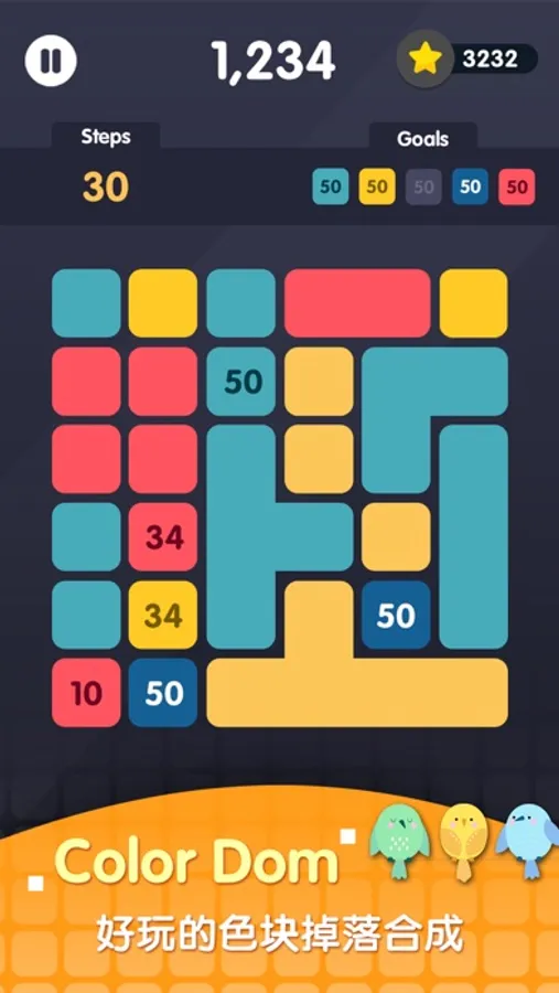 In a limited number of steps, the balls of the same color are connected to remove them, and the corresponding scores are obtained until the scores of the four colors satisfy the points required by the level. A ball with 3 or more identical scores will receive a 10x score. So you need to take a reasonable strategy and get the most points with the fewest steps.