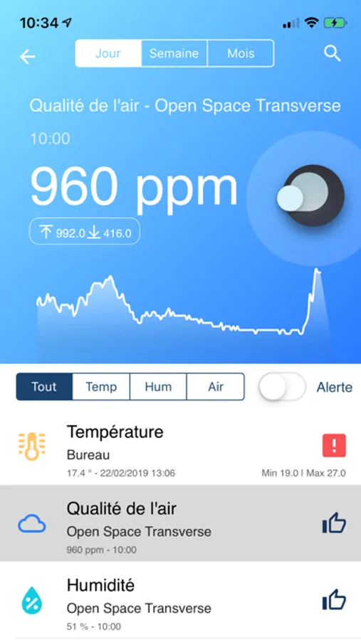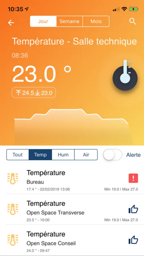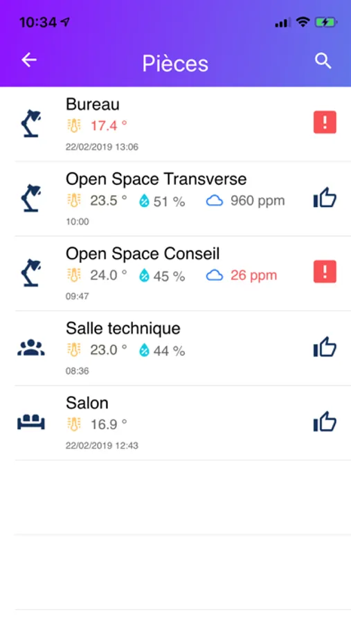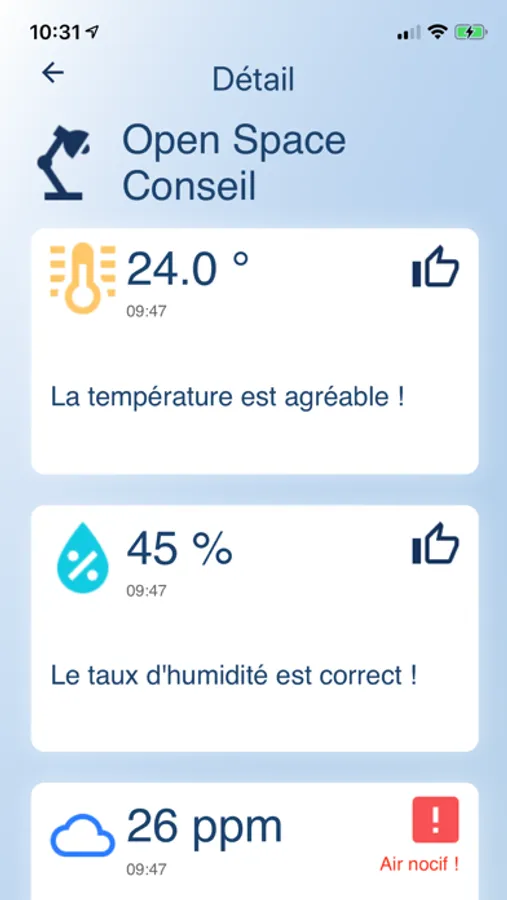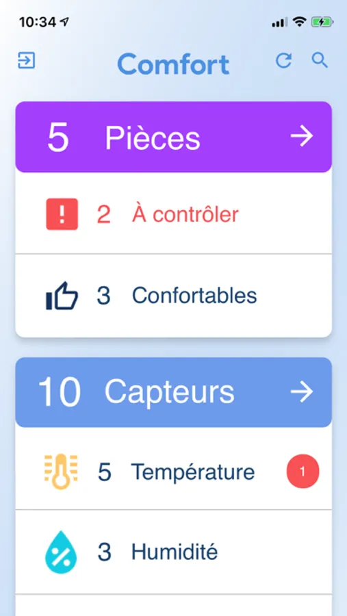 Grâce à la mesure de la température, du taux d'humidité et de la qualité de l'air, Comfort est capable de vous dire si une pièce est confortable pour les usagers ou si des actions doivent être menées pour améliorer le confort de la pièce.