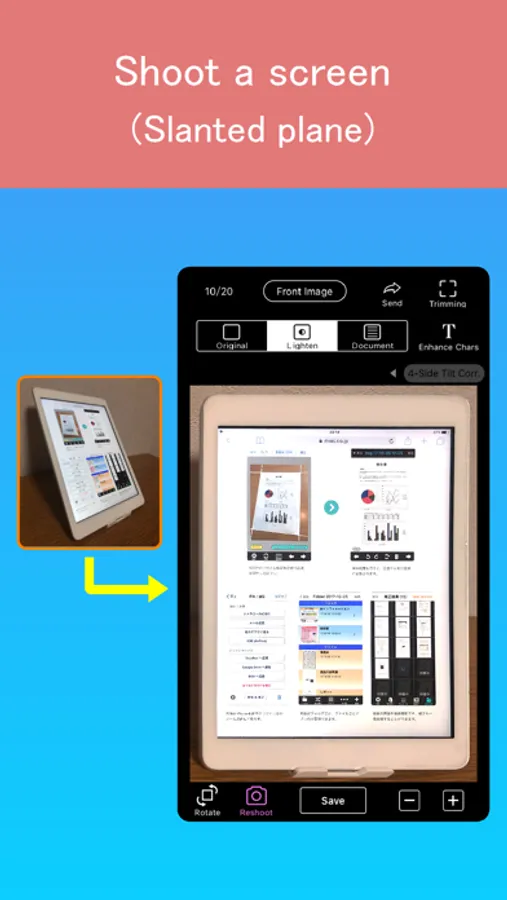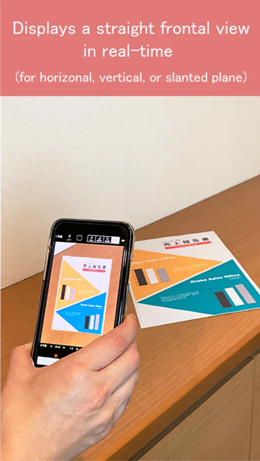 A straight frontal view of the plane can be seen in real-time, even if the camera is pointed from an oblique direction. Operation is simple, and you can see a straight frontal view of any plane, such as a document or wall.