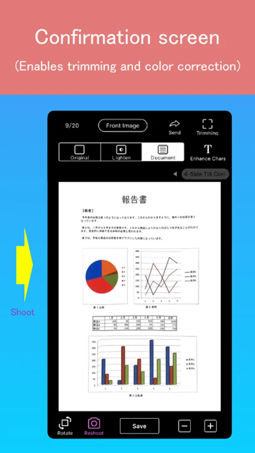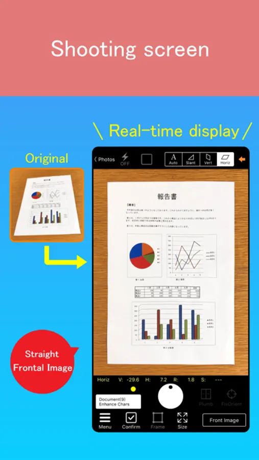 There are times when you want to shoot a straight frontal view of an object such as a document, wall, poster, or time-table. In cases like this, it is convenient if you can just point your camera from an oblique direction, and see the straight frontal view. FrontShot was developed to make this possible. Even if you point your camera from an oblique direction, any sort of plane --documents, walls, etc.-- can be viewed as a straight frontal image.