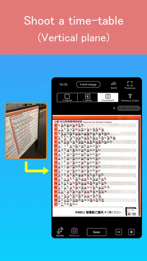 The app can be used for a variety purposes including: documents, posters, whiteboards, time-tables, buildings, signs, pictures, lettering and pictures drawn on the ground, and online sale items (clothes, books, CDs, other flat items).