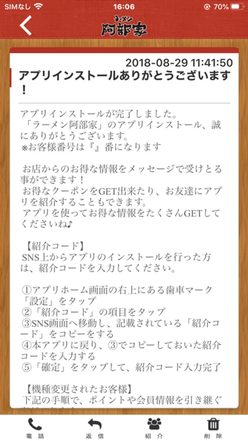 ラーメン阿部家のアプリをSNSを通じてお友達に紹介する事ができます。