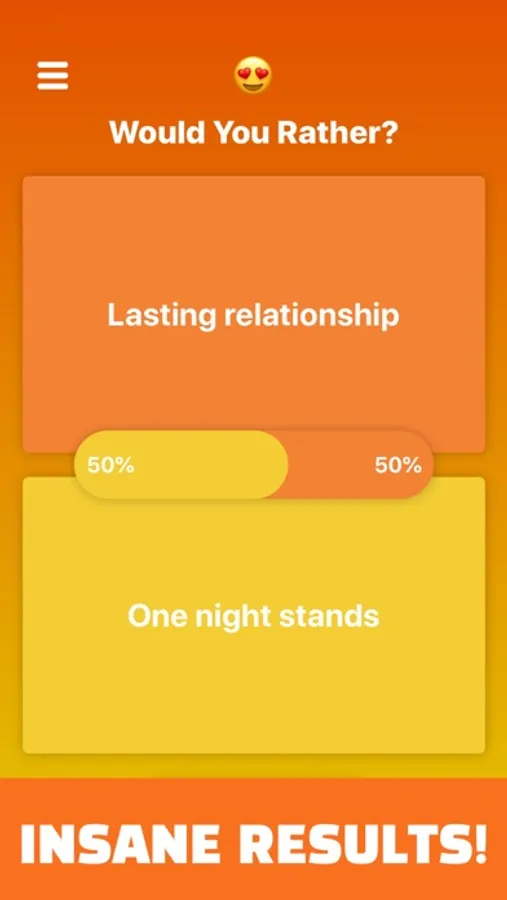 Well let us introduce to you our brand new app : "Would you rather?". Also known as "this or that", "what would you choose", or "either".