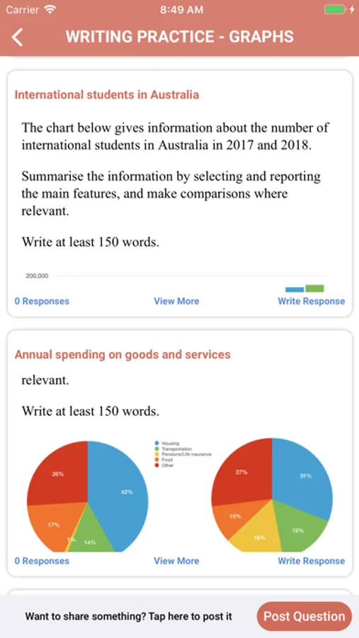 - a range of (real tests) questions covering most common types of essays, graphs, charts and letters.