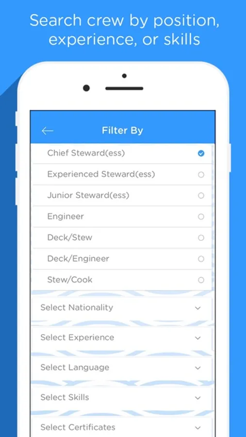 Search by position, experience, language, skills, qualifications, and nationality. Use the filter tool to find the exact crew you're looking for.