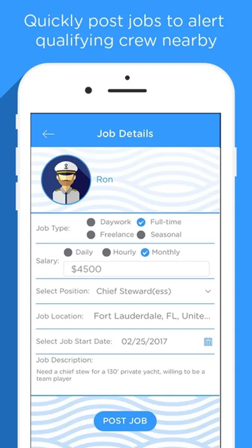 Post a job in minutes and automatically alert all qualifying crew nearby. Review applications and chat directly with crew securely.