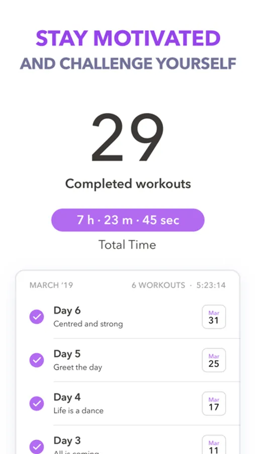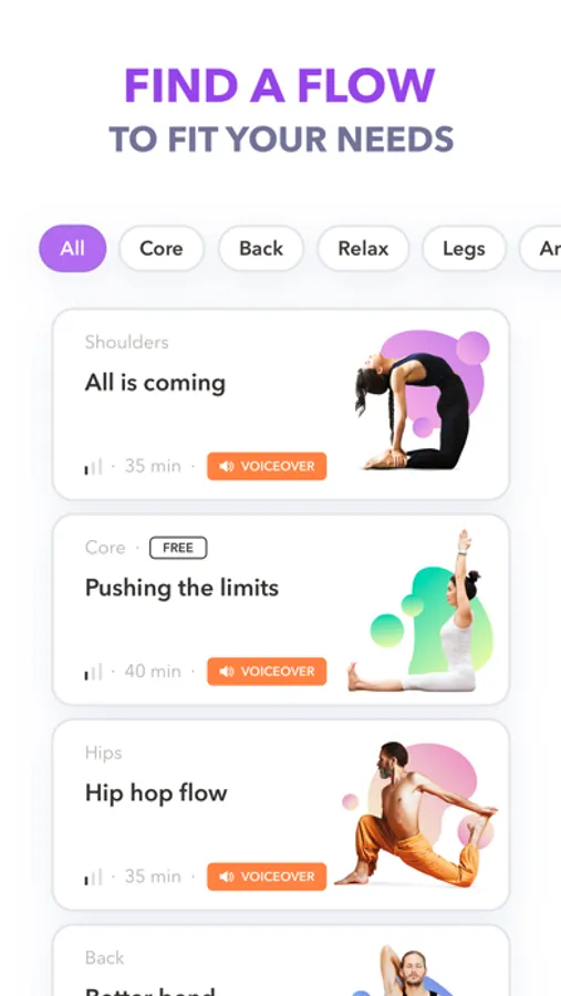 • Choose from a well organized collection of workouts that vary in difficulty, duration, target body part, level of intensity. There are core and dynamic workouts, yoga for meditation and relaxation, stretching and flexibility workouts, and many others.