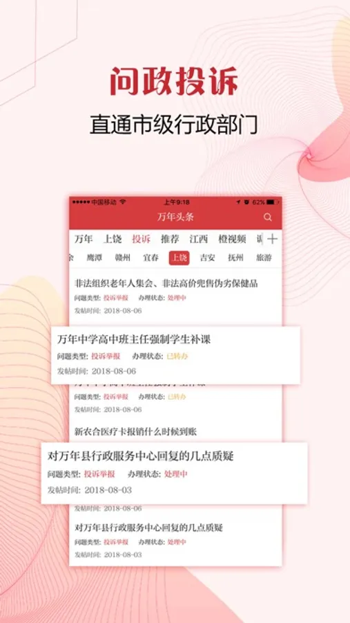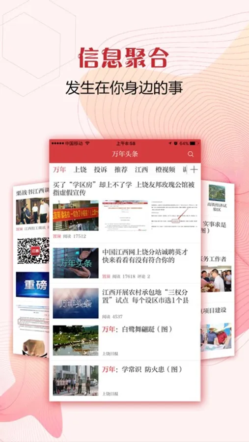 万年人自己的新闻头条客户端,应用内给广大用户提供本地新闻资讯、民声投诉、精彩短视频、本地分类信息发布、省内重大事件直播等服务,万年本地新闻,一手掌握!