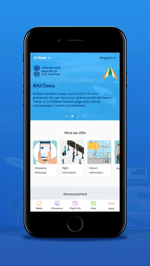 AirSewa is an initiative by the Ministry of Civil Aviation, Government of India. It provides a common platform for air travelers to submit air travel related grievances and seek information about flight or airport operational in India.