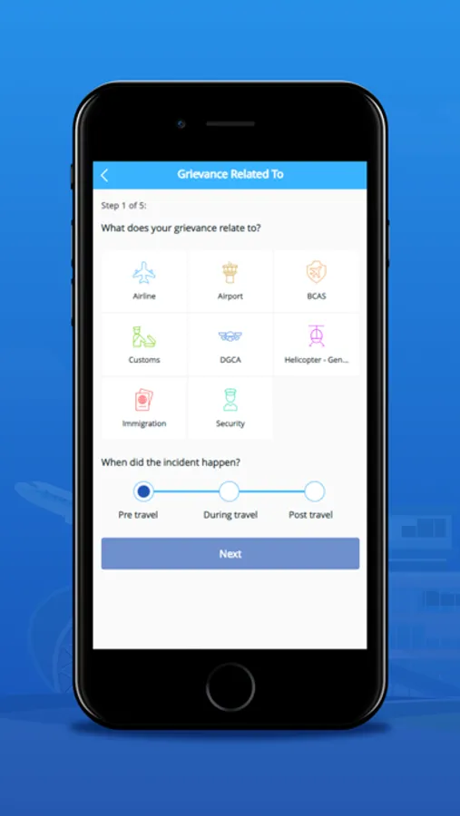 Submit & Track Grievances: User can submit grievances for selected categories (E.g.: Airline, Airport) and track them