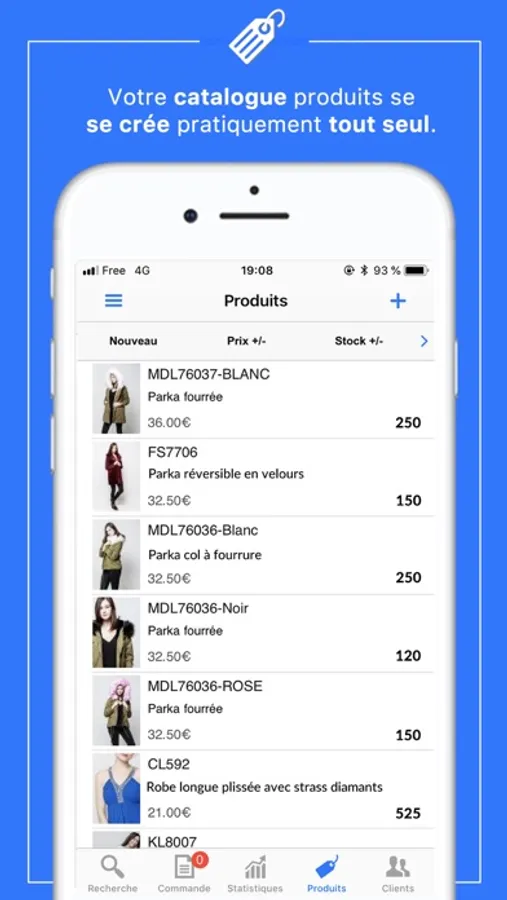 Créer facilement des nouveaux produits en quelques clics, composer le colisage, ajouter/prendre photos et quantité stock.