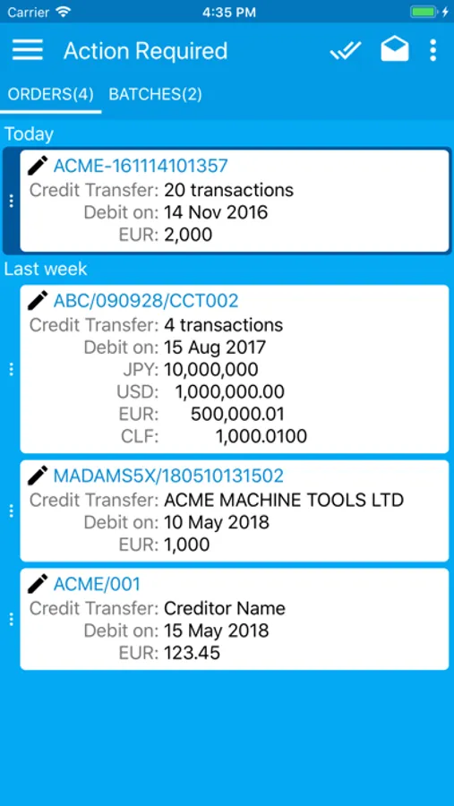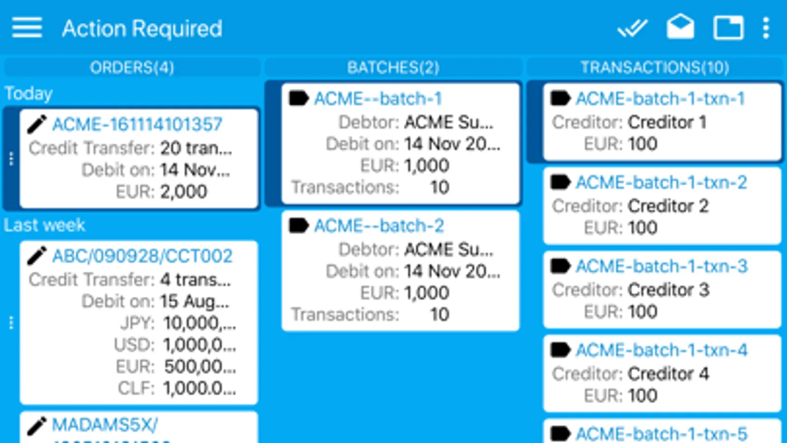 Users can review summary information and optionally drill into the detail of an eID or payment order. They can approve or cancel orders and also monitor ongoing status. Status is categorised with red/amber/green colour coding. All rejects are clearly flagged, with reason information.