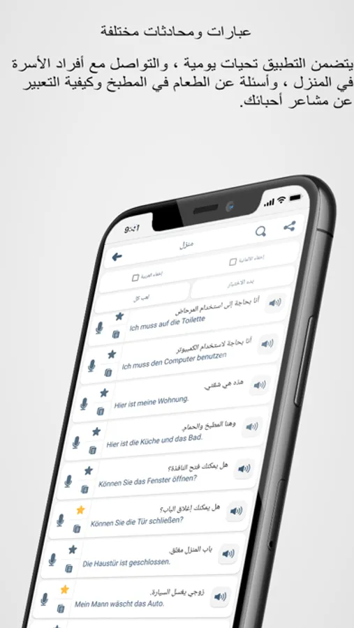 يوفر التطبيق أيضًا فرصة للاستماع إلى الجملة بصوت عالٍ من المتحدثين الألمان.