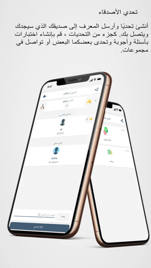 أنشئ تحديًا وأرسل المعرف إلى صديقك الذي سيجدك ويتصل بك. كجزء من التحديات ، قم بإنشاء اختبارات بأسئلة وأجوبة وتحدى بعضكما البعض أو تواصل في مجموعات.