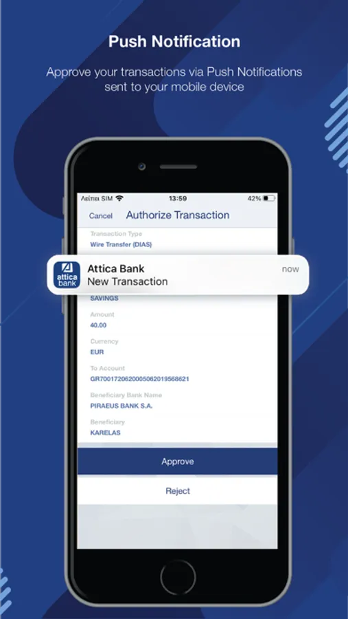 • ability to approve the execution of your transactions via Push Notifications, using Attica Mobile PIN or your biometrics (Fingerprint, FaceID).