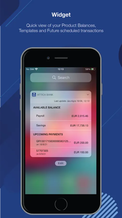 All the information about your Attica Bank products and their transactions, gathered in one place. In addition, thanks to the app’s easy-to-use widget, you have direct access to the balance of your portfolio products (deposits, cards, loans), scheduled orders and transaction templates.