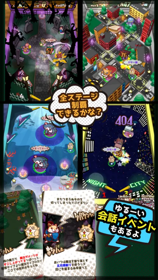 Cute 2D characters (monsters) hop around on pinball stage. and make lively battles with tackles and magics.