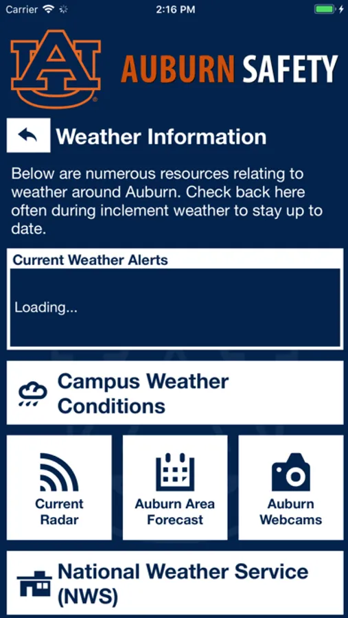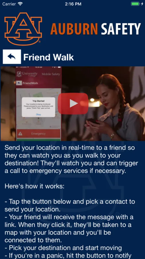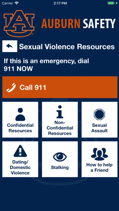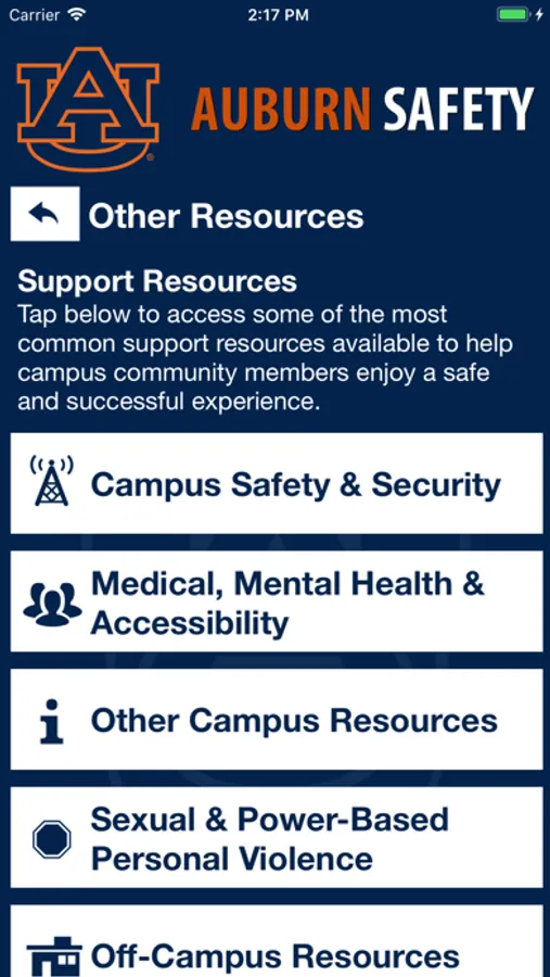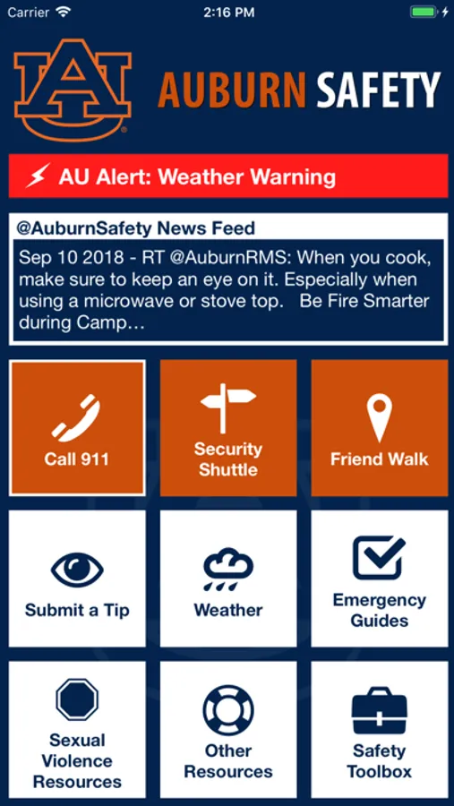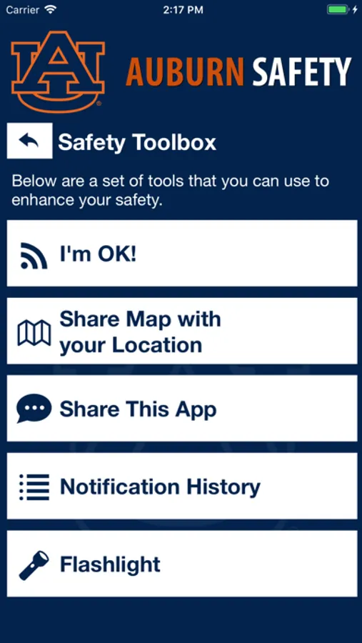 Auburn Safety is the official safety app of Auburn University. It is the only app that integrates with Auburn University's safety and security systems. Campus Safety has worked to develop a unique app that provides students, faculty and staff with added safety on the Auburn University campus. The app will send you important safety alerts and provide instant access to campus safety resources.
