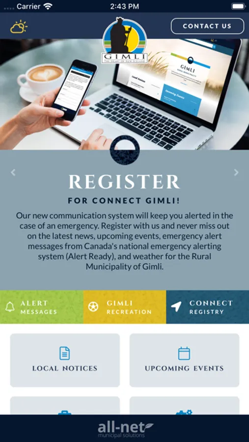 All-Net.ca Inc. has officially partnered with the RM of Gimli, Manitoba Canada to develop their community app. The app provides residents and visitors for the RM of Gimli important community information including council meeting minutes and agendas, local notices and upcoming events, business directory, service request submissions, local maps, weather and alert messages including emergency alert messages from Canada's national emergency alerting system (Alert Ready) .