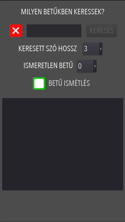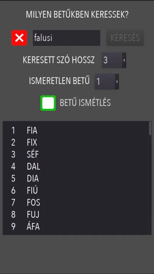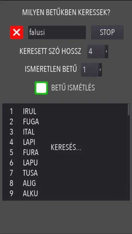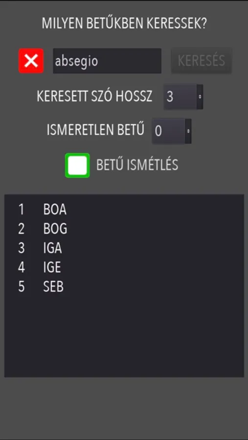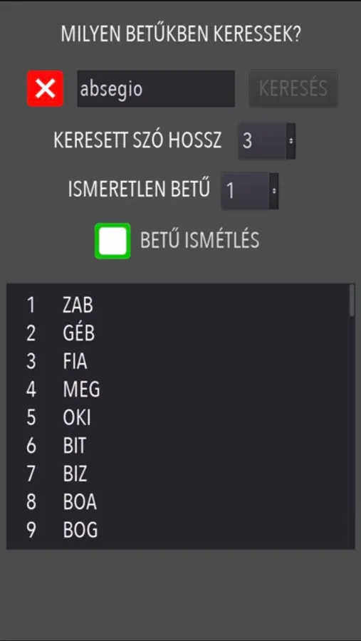 Az applikácio kb. 70 ezer magyar szóból találja meg a megoldást a betűi alapján.