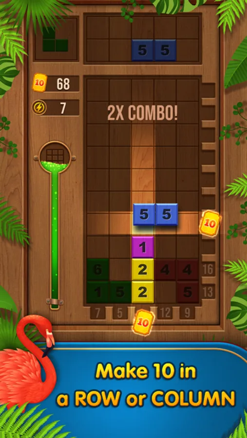Move the number blocks on the board to get total of 10 in any row or column and then you get scores!