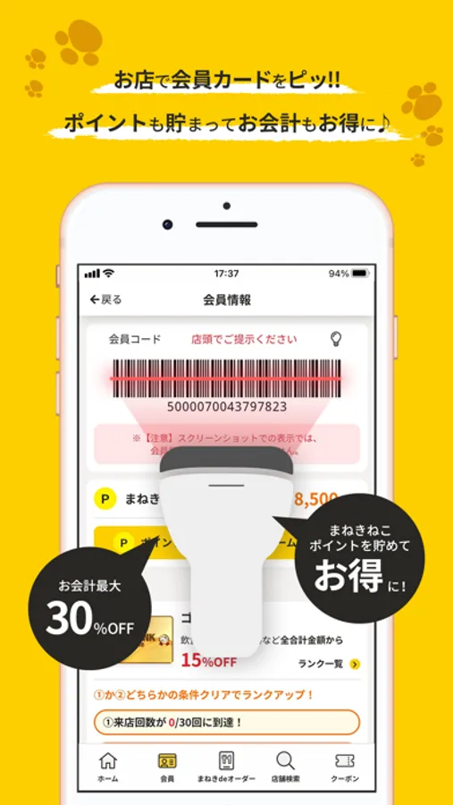 ご来店時に会員証としてご利用いただけるバーコードが表示されます。