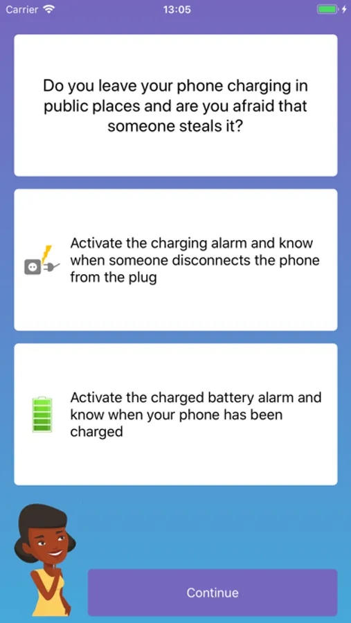 The main use of this mobile anti theft app is to prevent unauthorized access to your phone or tablet while you are charging your device. This will be very useful if you leave your phone charging in a public place because if someone other than you disconnects the phone from the charger, the anti theft security alarm you have chosen will start to sound to avoid that someone steals your phone.