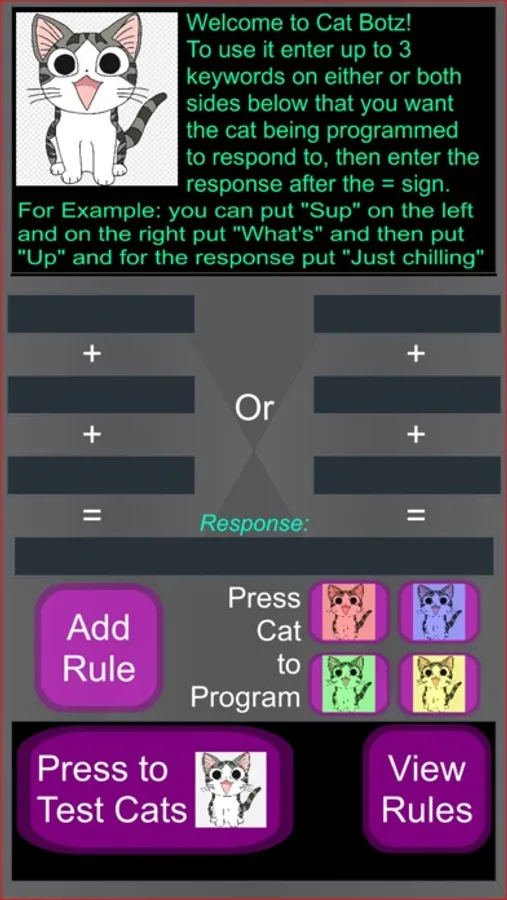 Program the Cat Botz to say any response to different sets of keywords that, if they detects said keywords in your chat, or by another cat, the cat bot will respond in the way you programmed it to - leading to a chain reaction of Catversations!