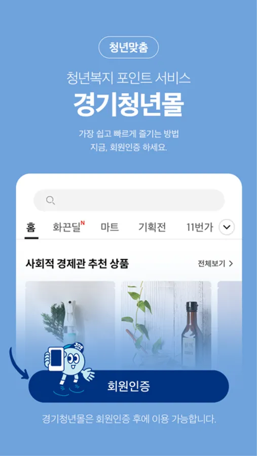 * 경기청년몰은 청년 복지포인트 사업 참여자 전용 Application으로 정식 회원 인증 후 이용 가능하시며, 마케팅 수신 동의 시 더 많은 전용 혜택도 받아보실 수 있습니다.