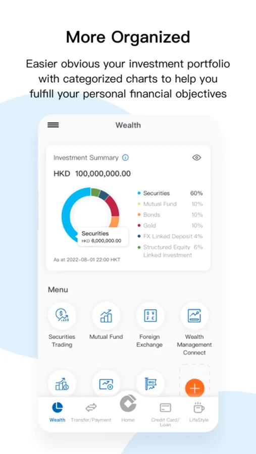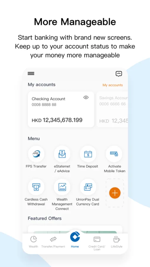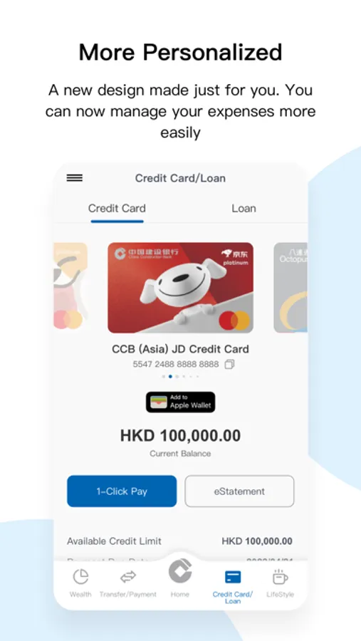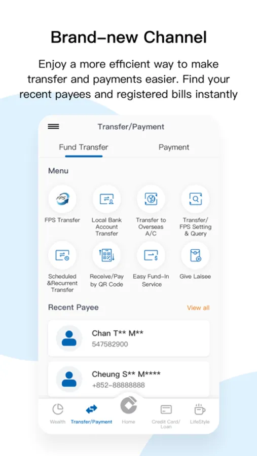 - Enhanced bottom navigation menu with brand-new five channels (including Home, Transfer/Payments, Credit Card/Loans, Wealth, and Lifestyle) to make your banking experience more flexible and suitable