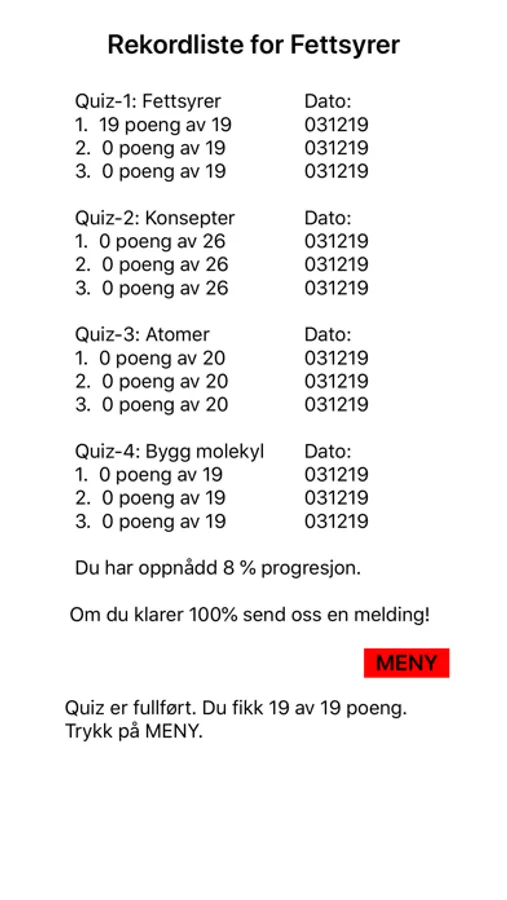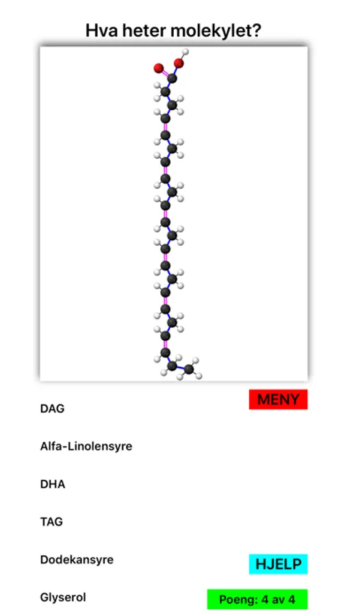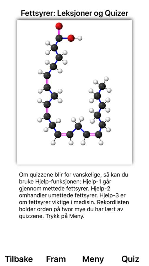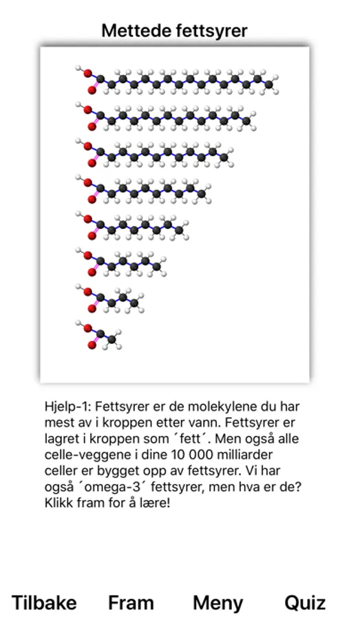 Fire interaktive quizer tester din økende forståelse av fettsyrer, signalstoff i hjernen og immunforsvar. Kjører du quizene 5 minutter hver dag på bussen vil du lære fettsyrer til bunns i løpet av kort tid.
